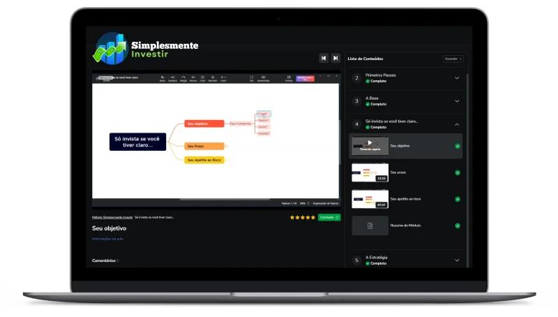 O conteúdo foi pensado para ser prático e objetivo, sem enrolação. Você pode seguir no seu próprio ritmo, mas em pouco tempo já estará pronto para aplicar as estratégias e começar a ver resultados. A gestão da sua carteira de investimentos, por exemplo, levará menos de 5 minutos por mês.